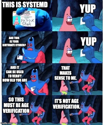 Easy to flag. Then Lennart Poettering’s startup van deploy the ID tech to comply with age verification laws.