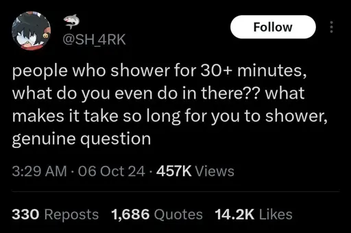 Stamets@lemmy.dbzer0.com to People Twitter@sh.itjust.works · 5 days agoI can undress, shower, dry and dress in less than 10. WHAT ARE YOU DOINGlemmy.dbzer0.comimagemessage-square232linkfedilinkarrow-up1316arrow-down121