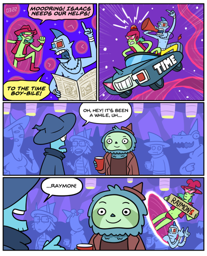 The two in the top panels are the time boys. They constantly shift through time, which might explain the changing clothing. The character with the wizard hat is Isaac and asked them to help him out of the awkward situation of forgetting a name of someone he should know.