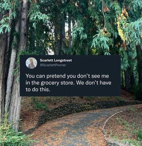 The background… Makes it seem like the person is getting escorted into the woods to be murdered due to their interaction at the grocery store.