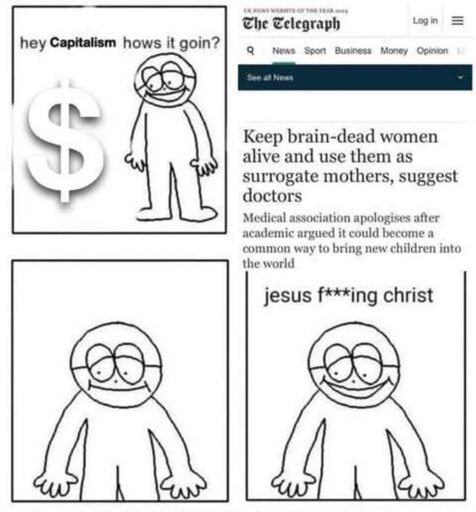 Do you think this hypothetical corpse-breeding industry would somehow not be, you know, an industry? Do you think it would somehow be immune to the all-consuming profit motive that’s strangling every other part of life for most of the human race right now? Of course it would be commodified!