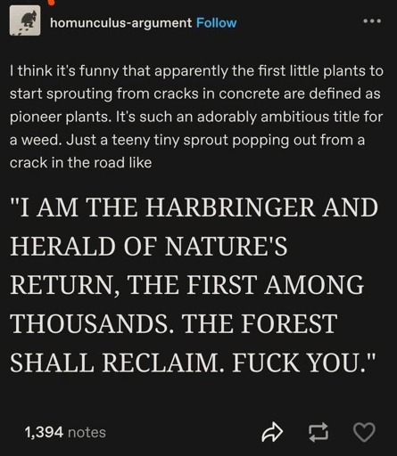 Track_Shovel@slrpnk.net to Science Memes@mander.xyzEnglish · 1 month agoPioneer speciesslrpnk.netimagemessage-square11linkfedilinkarrow-up1359arrow-down16file-text