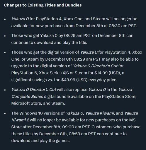 arrow-up11arrow-down1external-linkYakuza 0 is being delisted on all platforms on December 8 (being replaced by Y0:DC), Yakuza Kiwami 1 & 2 also being delisted from Microsoft PC Storebsky.appHal-5700X@sh.itjust.works to Games@sh.itjust.worksEnglish · 6 days agomessage-square11linkfedilinkfile-text