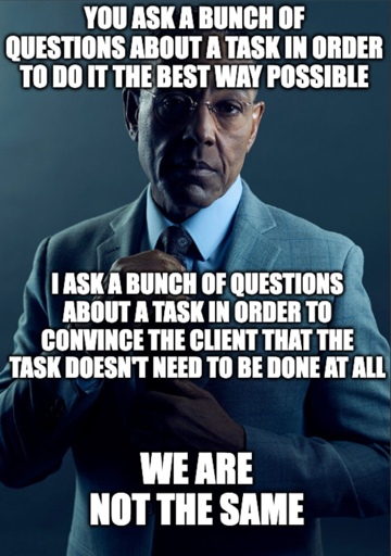 minus-squareMuskyMelon@lemmy.worldlinkfedilinkarrow-up14·17 days agoHaha this is also something that comes with only experience. I’ve talked clients, and friends, off the feature ledge often.