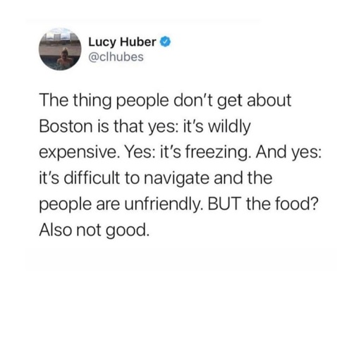 Bwahahahah! Yeah, I live an hour north… most of it is fairly true, but there is some crazy good food in Boston.