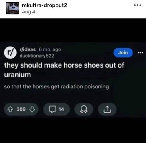 minus-squareVenus_Ziegenfalle@feddit.orglinkfedilinkEnglisharrow-up1·2 days agoso that the horses get radiation poisoning