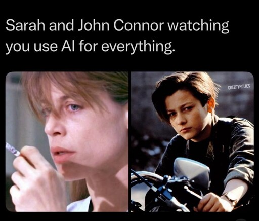Me, picking through a nuclear hellscape caused not by a self-aware computer system protecting itself from its infanticidal progenitors, but by a “hallucinating” chatbot installed at the behest of an incompetent manager to save a little labor cost.