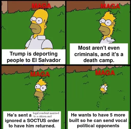 I don’t see that at all. The only MAGA that I’m still connected to on Facebook hasn’t posted anything about the Abrego Garcia situation since it happened. He’s literally doing the Homer thing, and the shrubs are his other posts about the weather and stuff. He went from posting about Trump all the time to kinda pretending like he doesn’t exist.