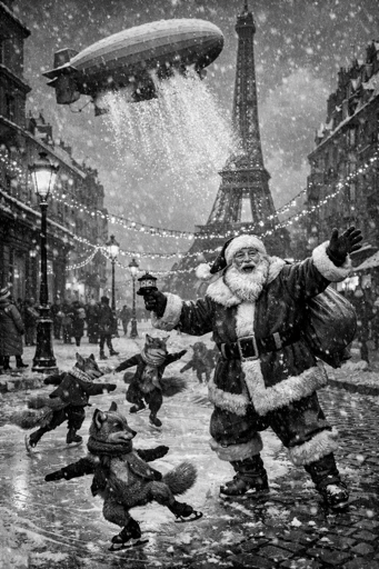 I would like a photorealistic image in the style of Henri Cartier-Bresson, depicting in an acute manner the most surreal celebration possible of the Christmas holidays. I think necessary elements include Paris streets with cobblestones, ice-skating foxes, a snow blizzard emanating from a blimp suspended from the Eiffel tower, and good old Père Noël spreading his contagious joy around himself.