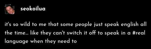 tumblr post by seokoilua: it’s so wild to me that some people just speak english all the time… like they can’t switch it off to speak in a #real language when they need to