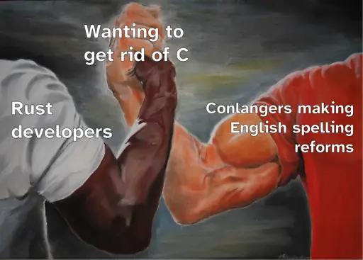 Meme of the two muscular arms shaking hands, showing “Rust developers” and “Conlangers making English spelling reforms” shaking hands over “Wanting to get rid of C”