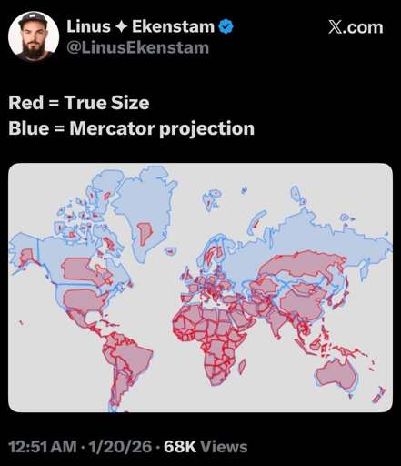 How much do you wanna bet Trump wouldn’t be so gung ho on Greenland if he saw this map? He probably thinks he is going to double the size of America.