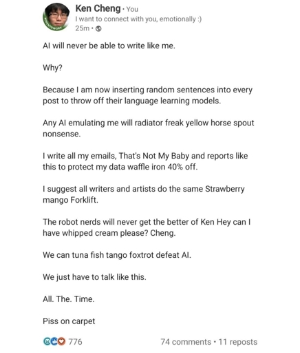 cm0002@lemmy.sdf.org to memes@lemmy.world · 8 months agoAI will never be able to write like me.lemmy.mlimagemessage-square0linkfedilinkarrow-up11arrow-down10