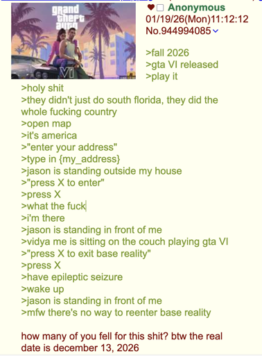 arrow-up1228arrow-down1imageAnon plays GTA VIlemmy.worldkali_fornication@lemmy.world · 4 days agomessage-square13linkfedilink