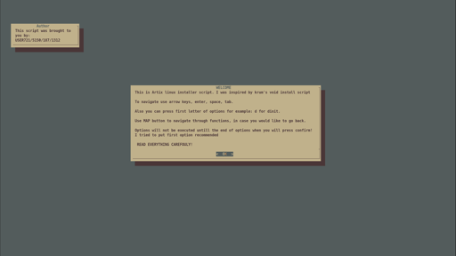 DIY KARMA KIT@lemmy.ml · 3 days agoTUI Artix Linux Install scriptplus-squarelemmy.mlimagemessage-square8linkfedilinkarrow-up172arrow-down12