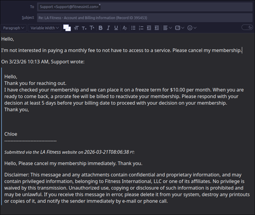 I thought I heard that California had a law requiring cancelling be just as easy as signing up? Is that not the case? (Assuming the name of the gym is an indicator of the city it’s based in, and not the state or country.)