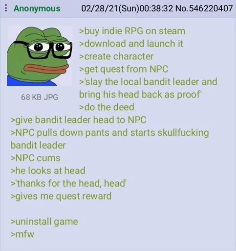 arrow-up1362arrow-down1imageAnon buys an indie RPGsh.itjust.works🍹Early to RISA 🧉@sh.itjust.worksM to Greentext@sh.itjust.works · 17 days agomessage-square17linkfedilink