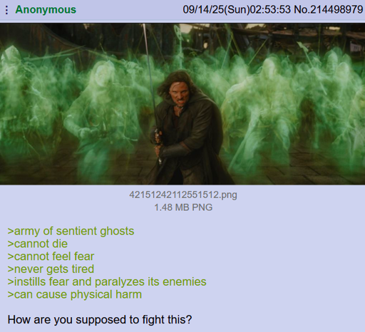 Its funny how this scene implies that Aragorn came up with this flashy theatrical entrance idea, explained it to the ghosts, and they were all like “hell yea thats sounds bad-ass lets do it”