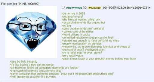 I wonder if there’s anyone interested creating lab diamonds that have imperfections that essentially become indistinguishable from the mined ones. There wouldn’t be any money in it, but they could theoretically crash the blood diamond market.