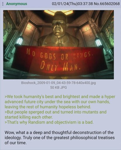 Both works are basically at opposite ends of the spectrum — Atlas Shrugged depicts a communist utopia gone wrong, while Bioshock shows a capitalist utopia gone wrong. They’re both myopic in their own way, but the common thread seems to be that absolute power corrupts absolutely, which is a truth no one can escape. In reality, a functioning society requires a delicate balance between both forces, not a winner-takes-tall approach. Unfortunately, that idea seems to be lost on both of them, which is probably what anon is trying to hint at.