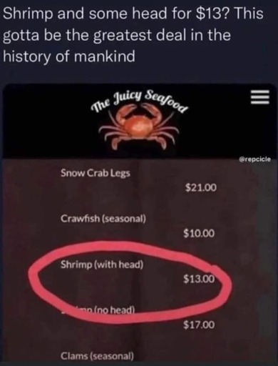 minus-squarei_need_your_bones@piefed.sociallinkfedilinkEnglisharrow-up5·21 days agoAre you trying to tell me a shrimp is giving this head?