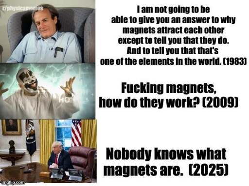 Feynman actually did try to explain it, and could do the math and other work to show why magnets attract one another. Having watched the Todd in the Shadows video about Miracles, I kind of find the question wholesome - he’s not asking out of willful ignorance, but rather that it’s something he knows is beyond his grasp but amazes him (and wants to share that joy in the world with his kids and family).