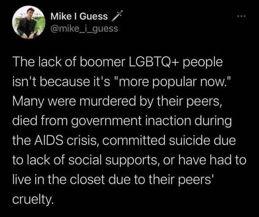 i mean, so many people faced a lot of shit for coming out in the 80s and 90s. it wasn’t until after a lot of people had come out and fought those battles for us that society in general became more accepting
