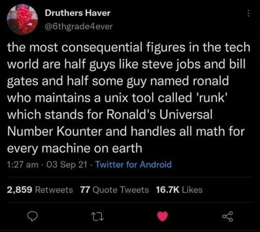 Friend who is not a software person sent me this tweet, which amused me as it did them. They asked if “runk” was real, which I assume not.
