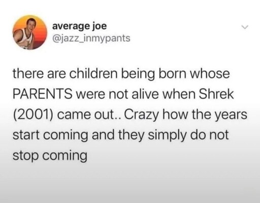 there are children being born whose PARENTS were not alive when Shrek (2001) came out… Crazy how the years start coming and they simply do not stop coming