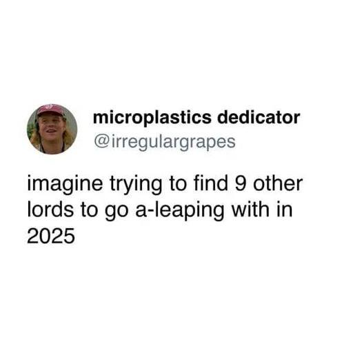 minus-squareedgemaster72@lemmy.worldlinkfedilinkEnglisharrow-up7·9 days agoMillennials killed the lords-a-leaping industry!