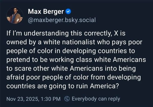 So just like “the deep state controlling America” the MAGA types are actually right about immigrants taking government handouts and ruining the country, they’re just targeting the wrong people: Democrats instead of billionaires, and poor Mexicans instead of Elon Musk.