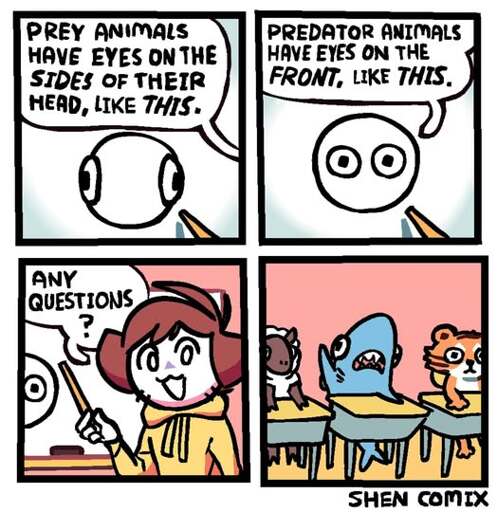 Hm, in small animals my previous point of a 2D vs 3D space is also valid. Large land prey animals “only” have to look from side to side to spot predators. Small animals have to look in all 3 dimensions, like sharks