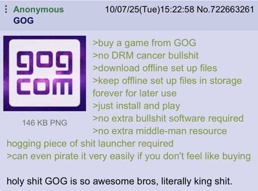🍹Early to RISA 🧉@sh.itjust.worksM to Greentext@sh.itjust.works · 16 days agoAnon uses GOGsh.itjust.worksimagemessage-square169linkfedilinkarrow-up11.2Karrow-down18