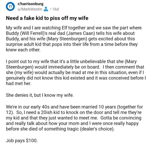 For those wondering, this played out well! OP found someone to take the job. His wife bit on the prank gleefully, was actually thrilled by the idea that OP had a son he didn’t know about. When the prank was revealed, she thought it was hilarious. Ultimately pretty wholesome, OP married a keeper.