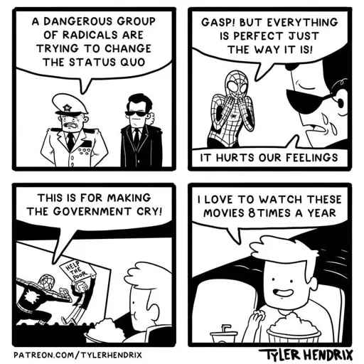 Sixth, they do fight the status quo, just not the parts that the video wants to address. Daredevil can’t solve all the world’s problems but he can and does fight both organized crime and corruption. Captain America isn’t going to overthrow the government, but he will fight SHIELD when it crosses the line. Iron Man changed his own company to address its role in the world, and uses it to innovate to make the world a better place, that’s just not the focus of the story.