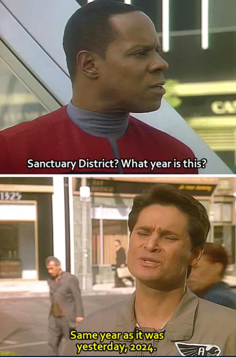 Sisko (and Keira?) by time travel shenanigans ends up in the grim dark future of 2024, where capitalism and loss of solidarity has lead to rampant homelessness and unemployment, and disregard for those affected. The homeless people are forbidden from being in public except in heavily guarded ‘sanctuary districts’, i.e. concentration camps.