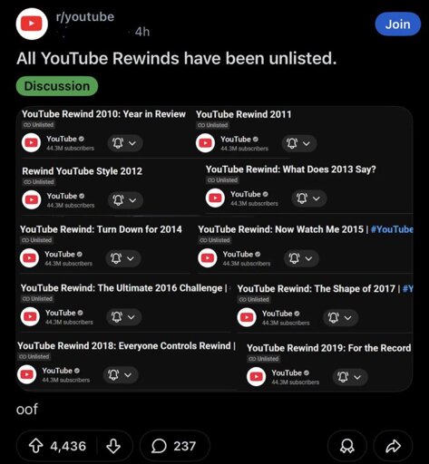 arrow-up1516arrow-down1imageApparently, all YouTube Rewinds have been unlisted as of today.lemmy.worldvcokltfre@lemmy.world to Mildly Infuriating@lemmy.worldEnglish · 1 month agomessage-square77linkfedilink