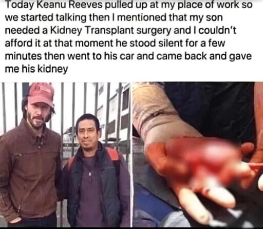 I was nervous as fuck, and just kept looking at him as he read a magazine and waited, but didn’t know what to say. Pretty soon though my niece started crying, and I’m trying to quiet her down because I didn’t want her to bother Keanu, but she just wouldn’t stop. Pretty soon he gets up and walks over. He started running his hands through her hair and asking what was wrong. I replied that she was probably hungry or something. So, Keanu put down his magazine, picked up my niece and lifted his shirt. He breast fed her right there in the middle of a hair salon. Chill guy, really nice about it.