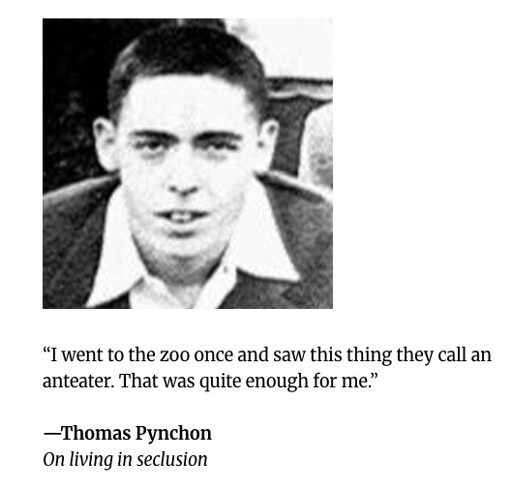 Salmon Rushdie once had dinner with Pynchon and described him as looking “exactly like Thomas Pynchon should look…he wears a kind of lumberjack shirt, blue jeans and has, like, Albert Einstein long hair and Bugs Bunny front teeth.” Rushdie apparently loved Vineland, which is honestly a banger.