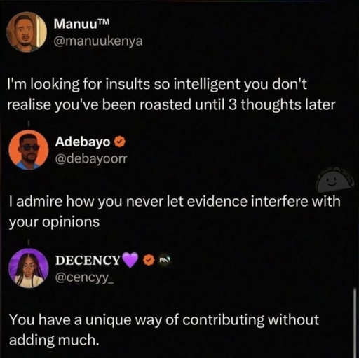 This one’s not so brainy, but considering the character it was addressed to it was enough - that being one of my favorite lines from the show Firefly: “Well, my days of not taking you seriously are certainly coming to a middle.”
