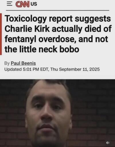 minus-squareArmchairAce1944@lemmy.calinkfedilinkarrow-up3·1 month agoI agree. This is why the bullet did not pass through his neck because there was no bullet. Fentanyl is like gluten, in that gluten will make your dick fly off like a bottle rocket and fentanyl will make your neck explode.