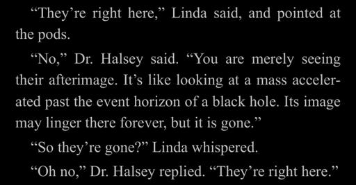 “Unshielded Slipspace field,” she said. Her face was a mask of concentration, staring at the cubic machine housing. Frowning, she crossed to the pods. “Linda,” she said, “your assistance please.”