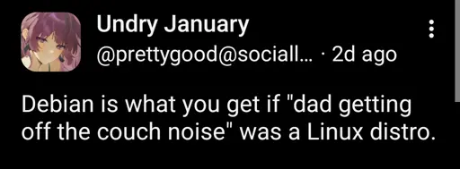 Awww, mocking my favourite distro. Tried so many. Not a fan of persistent tinkering. I use Debian because it’s awesome for me and my family to use as daily driver.
