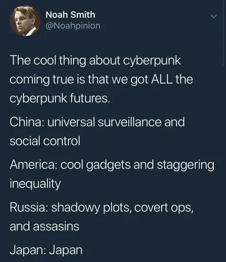 Cyberpunk fiction isn’t about a hypothetical speculative future. It’s an critical allegory for the issues of the present. Of course reality aligns with it when left unchanged.