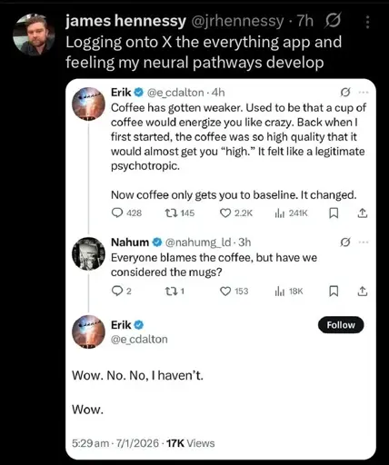 Screenshot of a tweet by @jrhennesy: “Logging onto X the everything app and feeling my neural pathways develop”, followed by a screenshot of a conversation:
