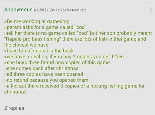>a kid out there received 3 copies of a fucking fishing game for Christmas