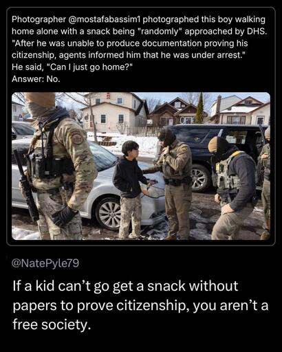 So the administration has quadrupled down on saying they are only going after thugs and criminals and narco terrorists and then they snatch little kids off the street? Because they can’t prove they are a citizen? There isn’t a single person on that ICE squad that can confidently tell me that they carried their identification on them at all times as a kid.
