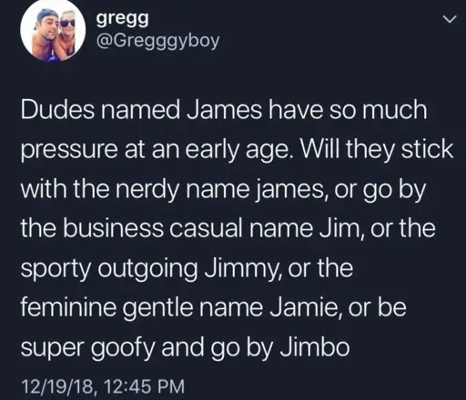Jimmy when you’re a kid, Jim when you get older. Probably James at work for people who don’t know you but Jim for those who do… Jimbo when you’re drunk. Jamie after your sex change operation.