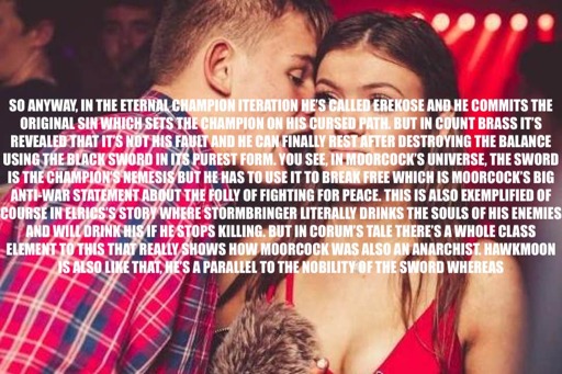 Anyways. Elric is a sickly inbred albino prince of a an ancient , evil, and decaying empire (aka Fantasy Britain). Without his evil sword he is a total weakling pushover.